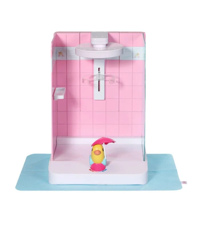 Een bad nemen in een badkuip vol schuim is heel ontspannend. Maar soms duurt dat gewoon te lang. Het is tijd voor een snelle douche!Nadat je de pop hebt bevestigd met een clip kan de waterpret beginnen. Draai aan Berta de eend om de elektrische pomp aan te zetten. Er stroomt echt water uit de douchekop. Wil je een warme of een koude douche? De eendenmengkraan laat je de denkbeeldige watertemperatuur zien. Berta de eend staat ook op de tegels en de glazen douchewand. Je kunt de douchekop verstellen, zodat alle broers en zussen de douche ook kunnen gebruiken. De hele BABY born–familie heeft plezier onder de waterstraal. De blauwe mat onder de douche voorkomt overstromen.