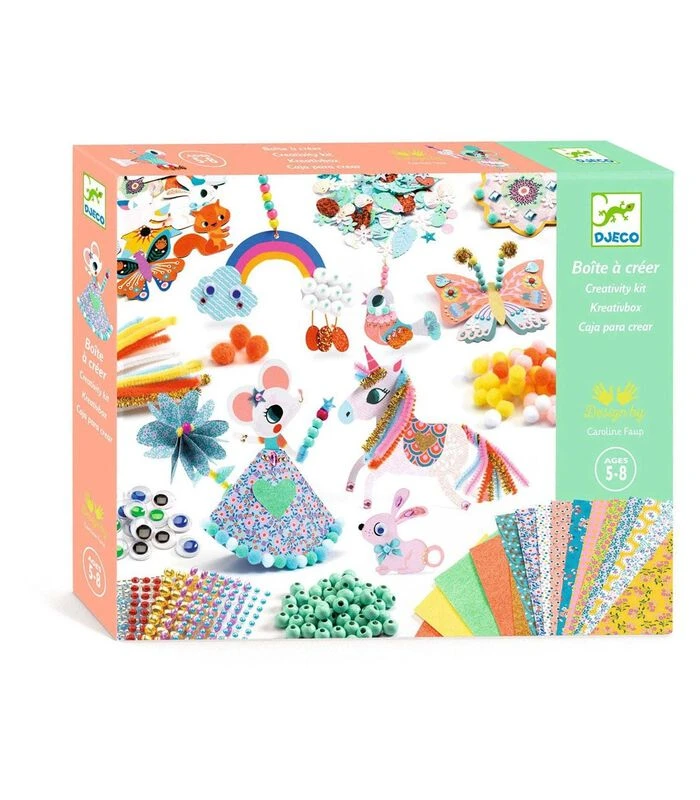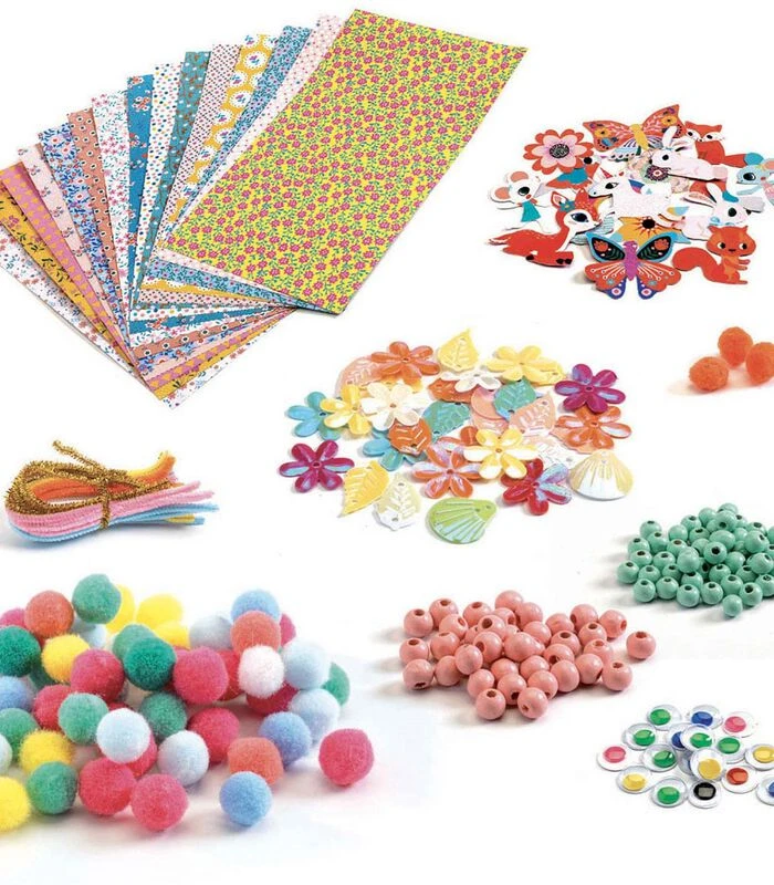 Inhoud: in een grote materiaaldoos met 2 verdiepingen met assortimenten van kralen, pompons, bewegende oogjes, stickers, edelstenen, chenilledraadjes enzovoort en bedrukt karton + 15 ideeënkaarten.
