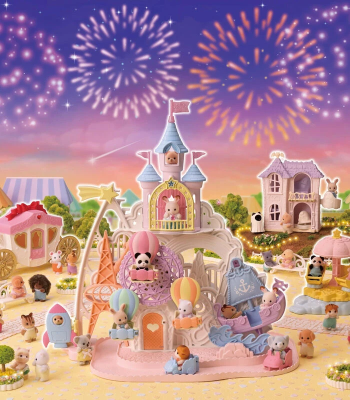 Het Baby pretpark heeft een geweldig kasteel en veel attracties. Er is een reuzenrad, een schommelschip, kartbaan en een raket. Pookie Panda Baby (zittend), Milk Rabbit Baby (zittend) en Perzische kat Baby (zittend) ) zijn inbegrepen. Omdat deze set wordt geleverd met babyfiguren, kan er direct mee gespeeld worden. Drie babyfiguren kunnen op het draaiende reuzenrad worden geplaatst. Twee babyfiguren kunnen op het schommelschip worden geplaatst en heen en weer worden geschommeld. 1 babyfiguur kan op de raket worden geplaatst die op en neer gaat. De figuren kunnen vanaf het balkon van het kasteel over het pretpark kijken. Er staat een tafel en stoelen aan de achterkant van het pretpark waar ze kunnen zitten en kletsen. Open de deur om de karts te vinden Er is een displaybord aan de achterkant van het pretpark waar je de babyfiguren kunt opstellen. Het is een leuke manier om tot 30 babyfiguren te laten zien. Combineer met de Royal Carriage Set, Baby Star Carousel, Spooky Surprise House en Baby Costume Series en andere babyfiguren voor nog leuker pretpark–fantasiespel (allemaal apart verkrijgbaar). ”